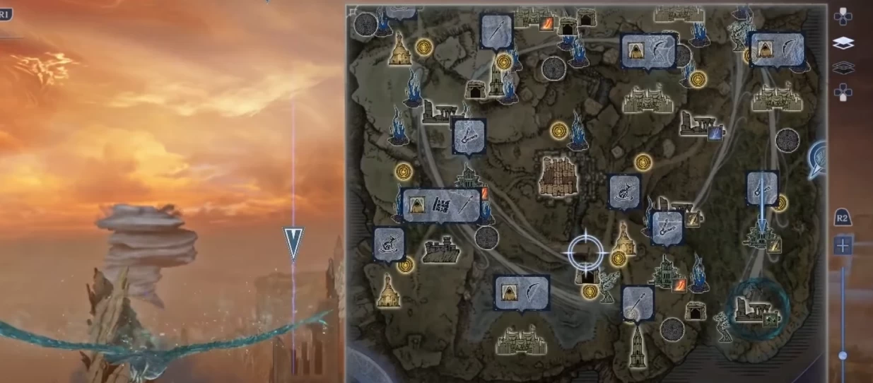Ещё перед посадкой вы можете включить расширенный режим карты, чтобы посмотреть — какой лут и где может выпасть. Не ведитесь на иконки, так как они не гарантируют того, что эти предметы обязательно выпадут. Просто в этих местах шанс их дропа будет выше. А вот что касается башен магов, то с них гарантированно упадёт хотя бы один посох.