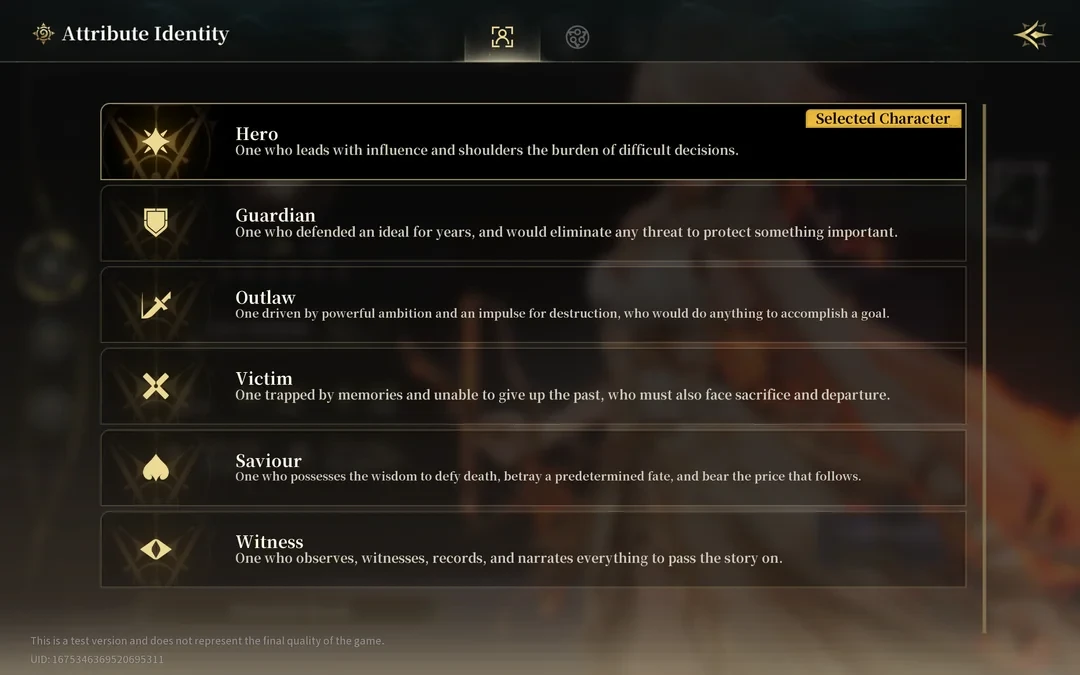 В игре персонажи разделяются на следующие роли: герой, защитник, разбойник, жертва, спаситель и свидетель. К сожалению, сама игра не даёт чёткого определения этим классам. Вместо этого жертва описывается как «тот, кто находится в ловушке своих воспоминаний и не может расстаться с прошлым, кому постоянно приходится чем-то жертвовать».