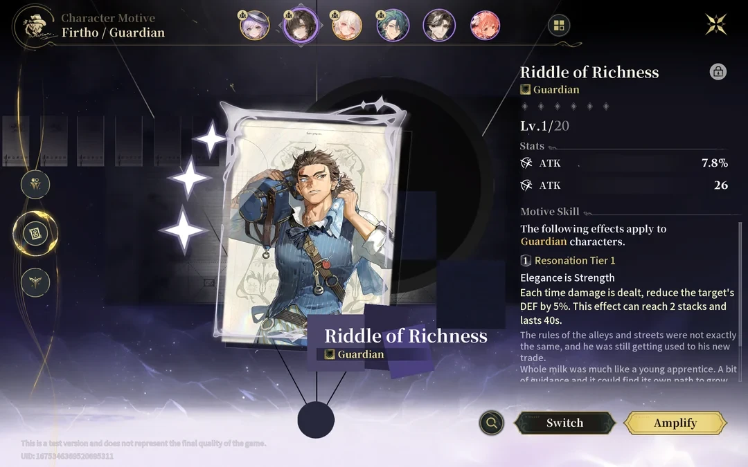 Вместо оружий в игре есть «мотивы». Они привязаны к классам и дают бонусы и пассивки. Возьмём за пример «Riddle of Richness». Эта карточка имеет уровень прокачки и возвышения, повышает ATK и уменьшает DEF врагов.
