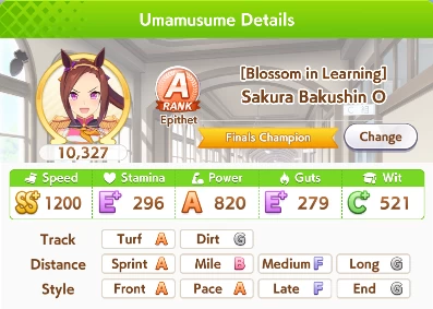 Топовой пони для короткой дистанции считается Sakura Bakushin O. По сравнению с другими хорошими SSR-вариантами у неё есть одно важное преимущество — она бесплатная. Кроме того у неё есть бонус +20% к скорости и +10% к интеллекту. Чтобы раскрыть потенциал персонажа, его нужно возвысить до 3-го уровня.