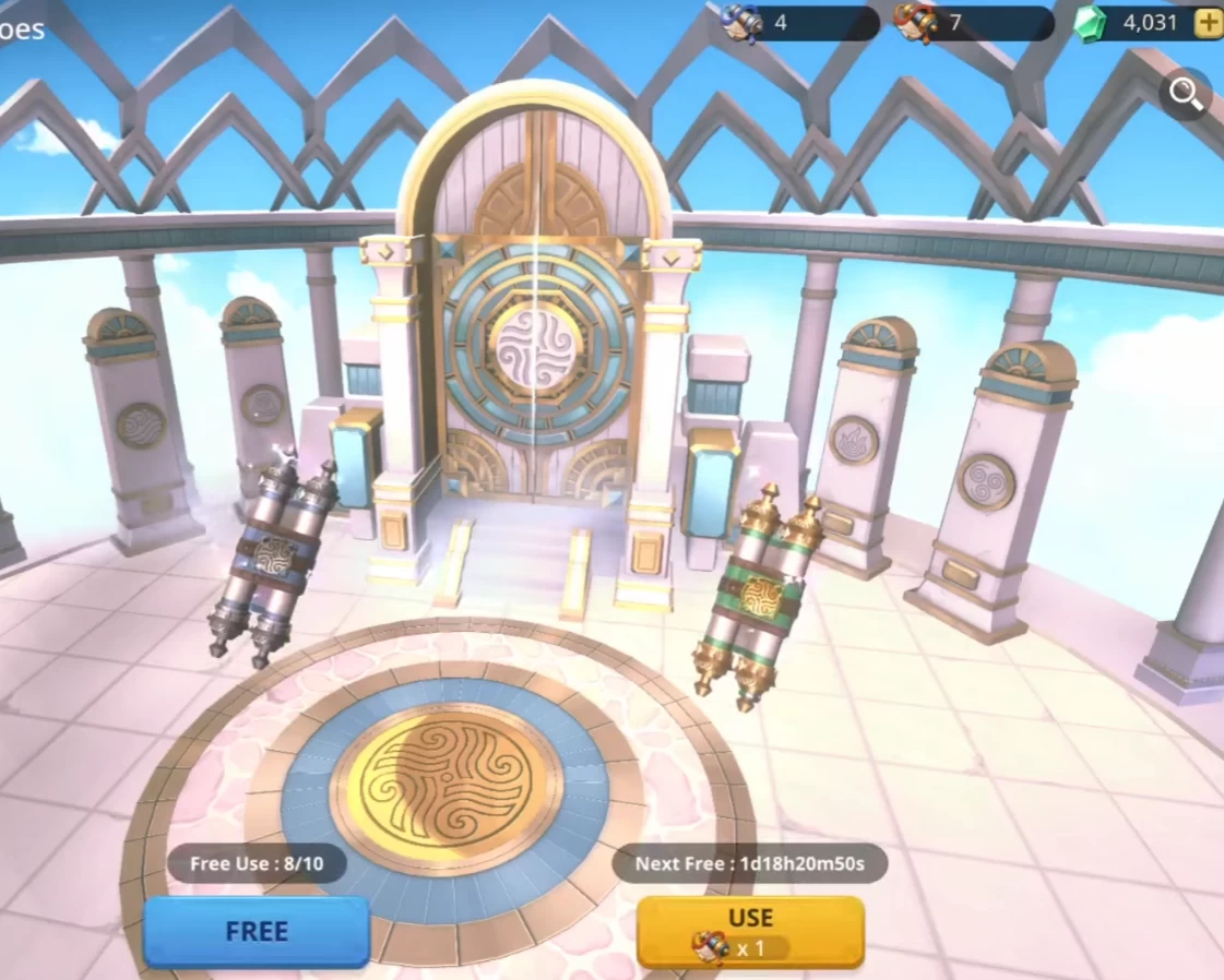Следом идёт Алтарь Героев. Вы можете подумать, что он нужен для гача-круток, но на самом деле он даёт бесплатные бонусы: свитки, ускорения и ресурсы. Например, если прокачать его до 30-го лвла, вы будете получать 10 серебряных свитков, а кулдаун на золотой свиток уменьшится до 2 дней.