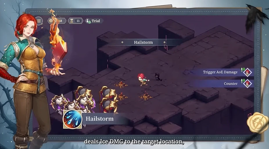 Навык «Град» наносит ледяной AoE-урон. После этого Трисс входит в состояние подготовки, что позволяет ей снова использовать «Град» через 1 ход.