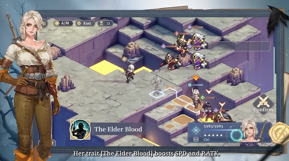 Пассивка увеличивает скорость и физическую атаку. В конце хода Цири может недалеко телепортироваться и снова совершить действие. Также она восстанавливает энергию и уменьшает КД скиллов.
