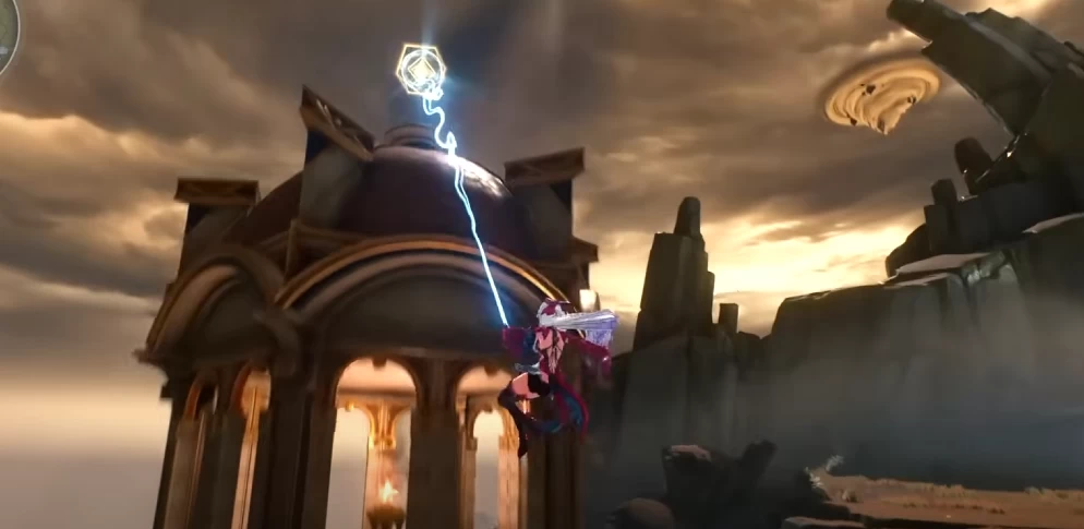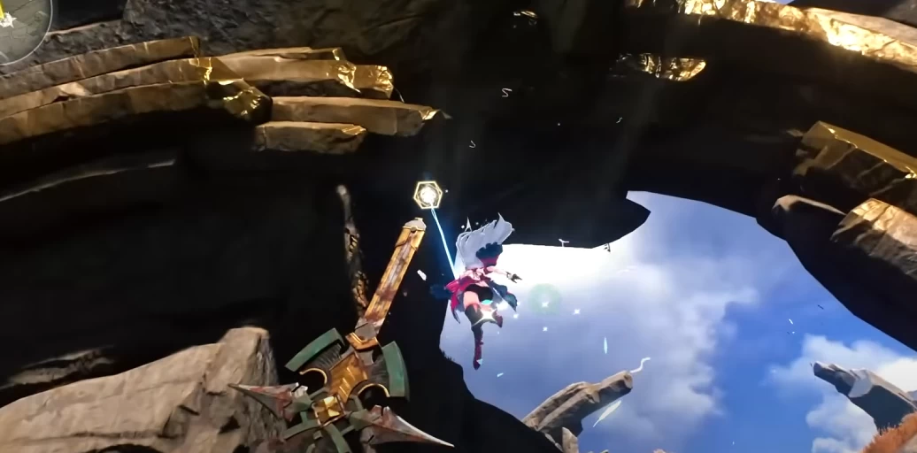 Продвигаемся дальше вдоль ущелья после моста. Внизу нас ждёт шкатулка, к которой нужно притянуться.