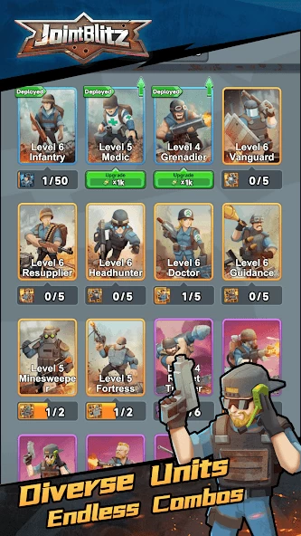 Joint Blitz это новая мобильная игра про военный конфликт, где вы отдаёте команды пехоте с различным вооружением и вызываете ракетные удары по вражеским позициям. И всё ради того, чтобы захватить базу и пройти уровень. Благодаря этому вы получаете валюту и материалы прокачки карточек своих юнитов.
