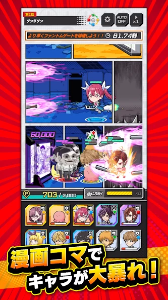 Shonen Jump+ Jumble Rush делают в формате Tower Defense, причём основной экран сделан в формате цветной манги, отдалённо напоминая старенькую Comix Zone с SEGA Genesis. Игроки будут коллекционировать персонажей разной редкости и активировать ультимейт «JUMBLE RUSH», чтобы провести комбо-атаку, сметающую всех врагов с экрана.