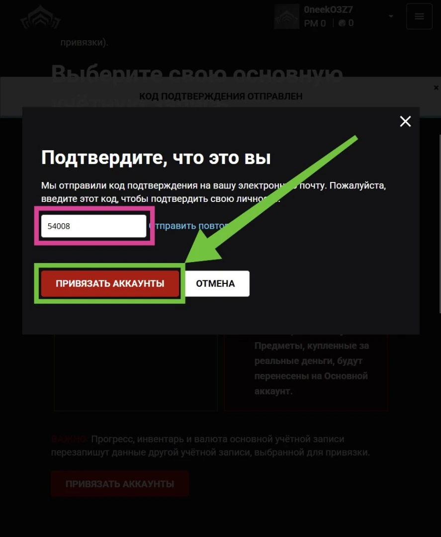 - Теперь подтверждаем связывание аккаунтов через ввод кода, отправленного на вашу почту основного аккаунта игры.