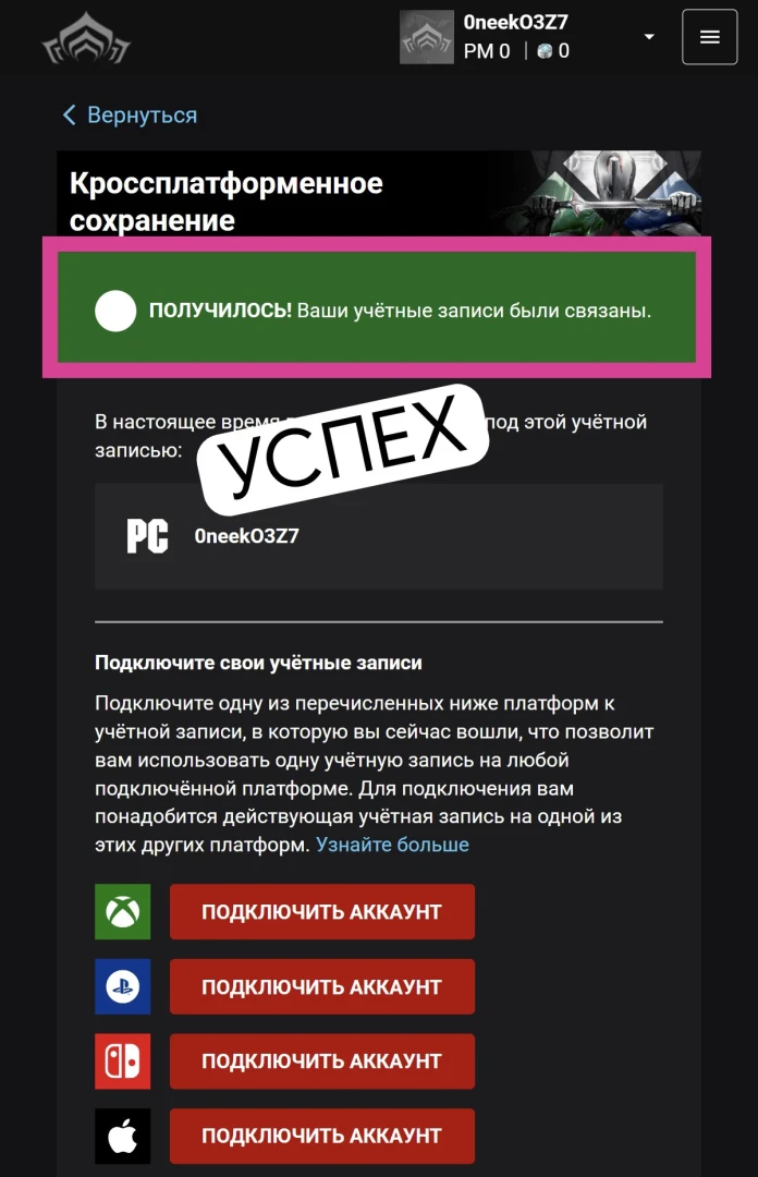 Успех! Если вы сделали все правильно, то в следующем окне увидите надпись в верху сайта, уведомляющую об успешном связывании ваших аккаунтов: основного с наличием прогресса в игре и пустого - аккаунта Google.