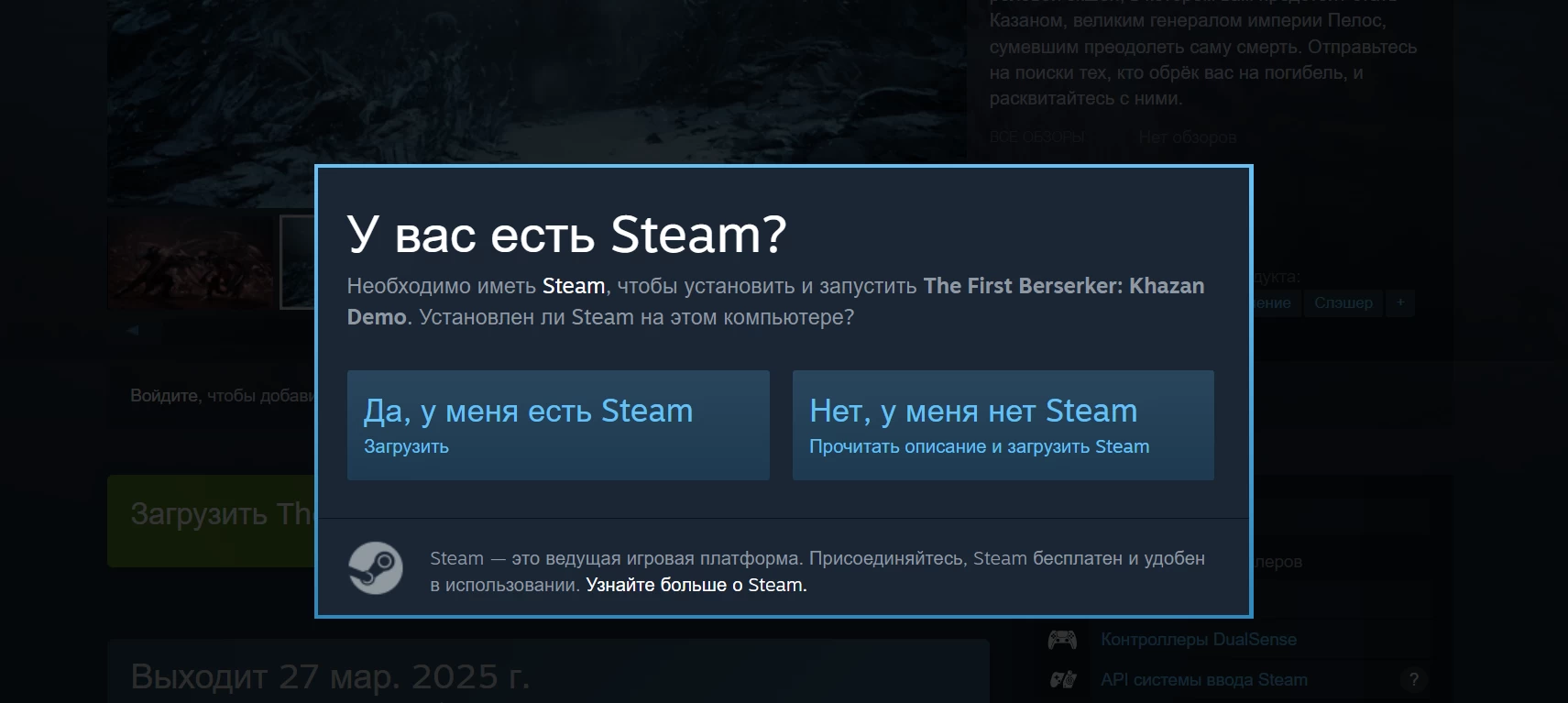 Для The First Berserker: Khazan стала доступна демоверсия на PC и консолях. В российском Steam проект недоступен, но есть вариант скачать его на свой РУ-аккаунт. Для этого зайдите на страницу игры через браузер, нажмите на кнопку «Загрузить» демоверсию и выберите вариант, что у вас уже есть Steam. После этого загрузите файлов на 30 ГБ и играйте в демоверсию не меняя региона.