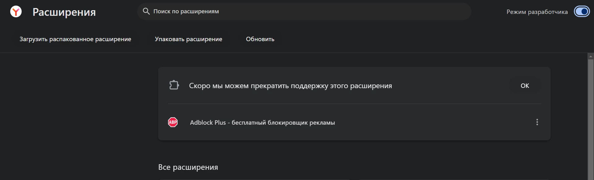 Порой продвинутым пользователям нужно включить режим разработчика в браузере, чтобы, например, запускать кастомные скрипты. Включить этот режим можно введя в url-строке «browser://extensions/». Остаётся только нажать на «галочку» в правом верхнем углу.