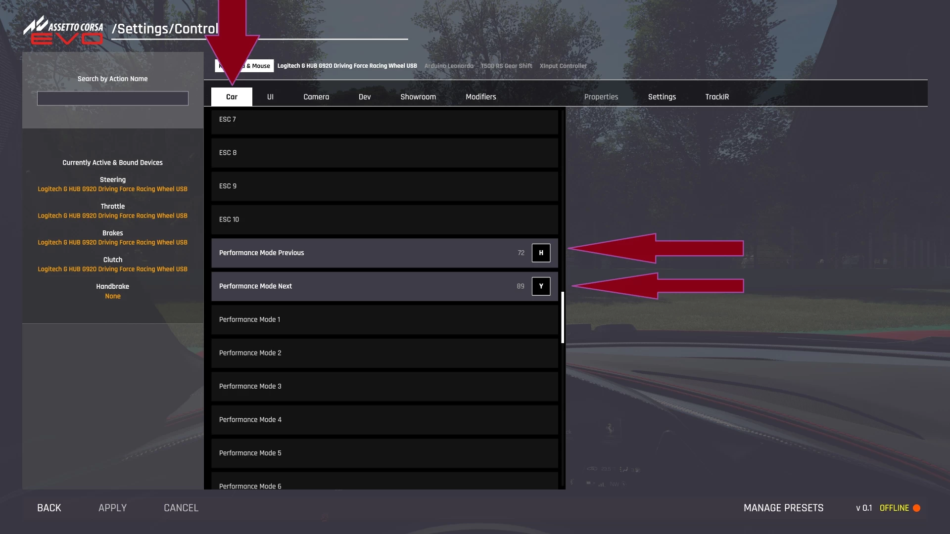 Чтобы переключаться между режимами езды в Assetto Corsa EVO нужно открыть настройки управления и забиндить кнопки, как на скриншоте. Следующие машины поддерживают подобную фичу: