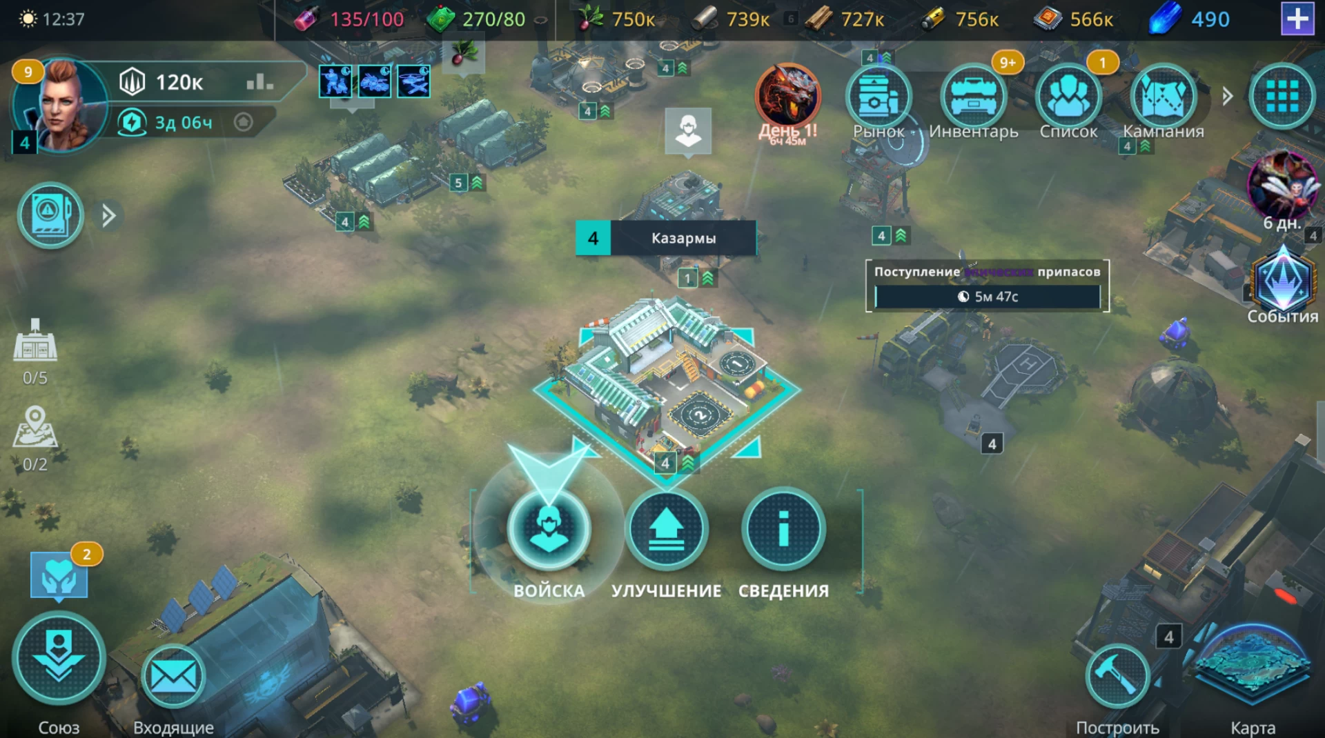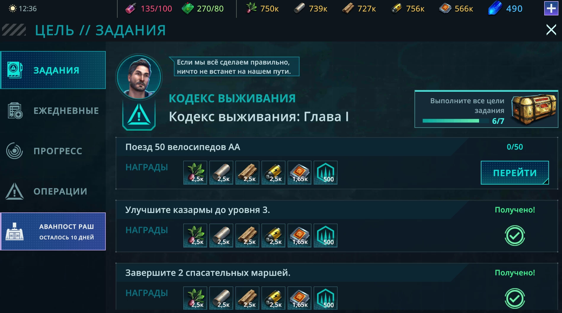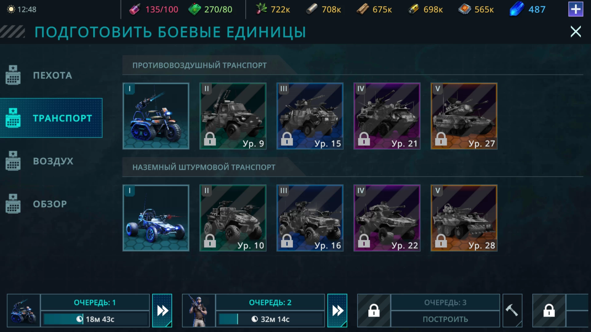 На самом деле от вас просят войти в казарму и подготовить 50 воздушных мотоциклов, который находятся в разделе «Транспорт». До этого сложно дойти самому, так как вместо того, чтобы переводить вас в казарму (особенно если у вас все очереди на строительство и подготовку заняты), игра будет показывать вам ваши очереди, из-за чего вы можете ошибочно подумать, что нужно быстро завершить одну из работ, потратив ускорители или премиальные кристаллы. Так вот, чтобы не быть мной, я вас сразу оберегаю от лишней траты ресурсов.