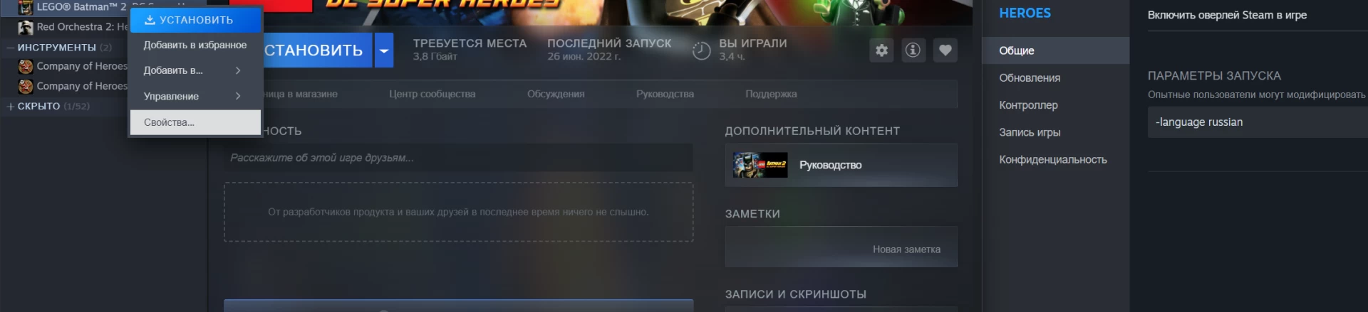 Чтобы играть в Lego Batman 2: DC Super Heroes на русском языке нужно открыть свойства игры в Steam и в разделе «Общие» прописать параметр запуска «-language russian».