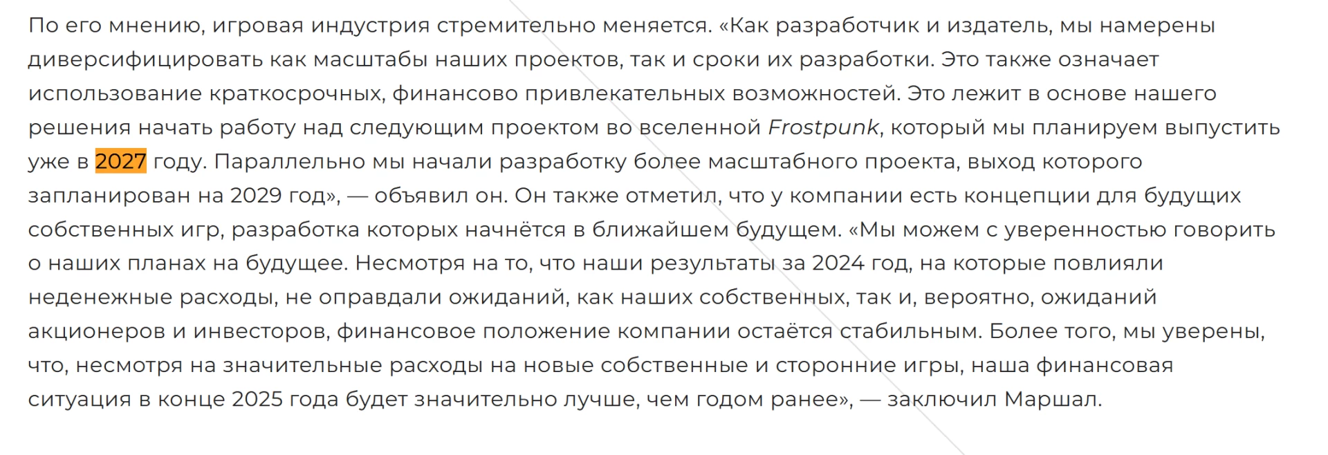 В финансовом отчёте перед инвесторами польская компания 11 bit studios сообщила, что следующий проект по вселенной Frostpunk выйдет в начале 2027 года. А вот крупный проект по этой франшизе выйдет только в 2029 году. Пока сложно сказать, в какую из этих дат выпустят Frostpunk 3.