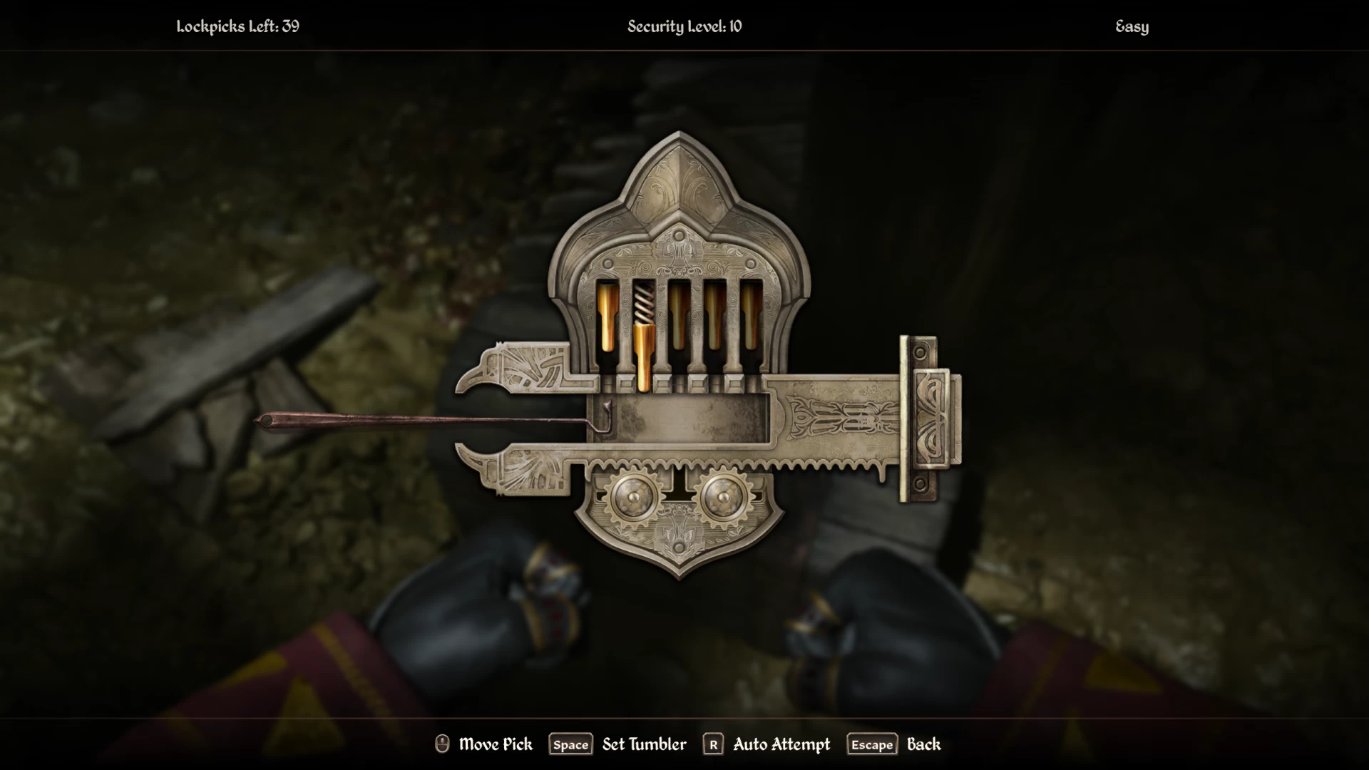 В TES IV: Oblivion Remastered нужно использовать отмычки, чтобы взламывать замки. Они бывают разной сложности, но система вскрытия схожа — при помощи клавиши W вы толкаете подвижные элементы вверх и пытаетесь нажать ЛКМ или Пробел в момент, когда элемент находится в самом верху.