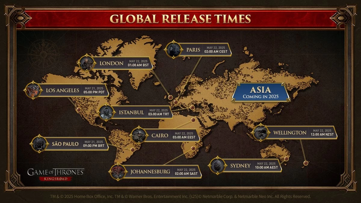 Поиграть в Game of Thrones: Kingsroad можно будет уже завтра — сервера откроют 22 мая в 3:00 ночи по мск. Ориентироваться на официальном скриншоте нужно по Стамбулу (Istanbul), так как этот турецкий город также находится в часовом поясе UTC+3, как и Москва.