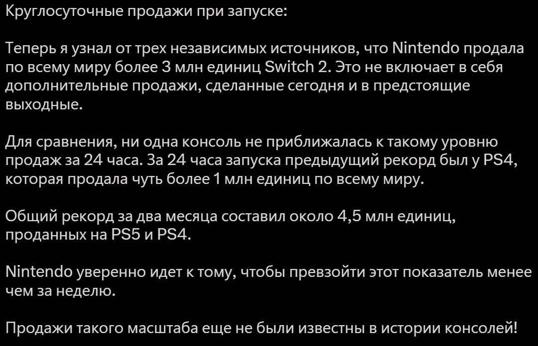 Игры за $80 не остановили фанатов Nintendo — по информации от трёх независимых источников, ютубер «Nintendo Prime» заявил, что продажи Nintendo Switch 2 за первые 24 часа по всему миру составили более 3 млн единиц. Предыдущий рекорд был у PlayStation 4, которая продалась тиражом чуть более 1 млн единиц.