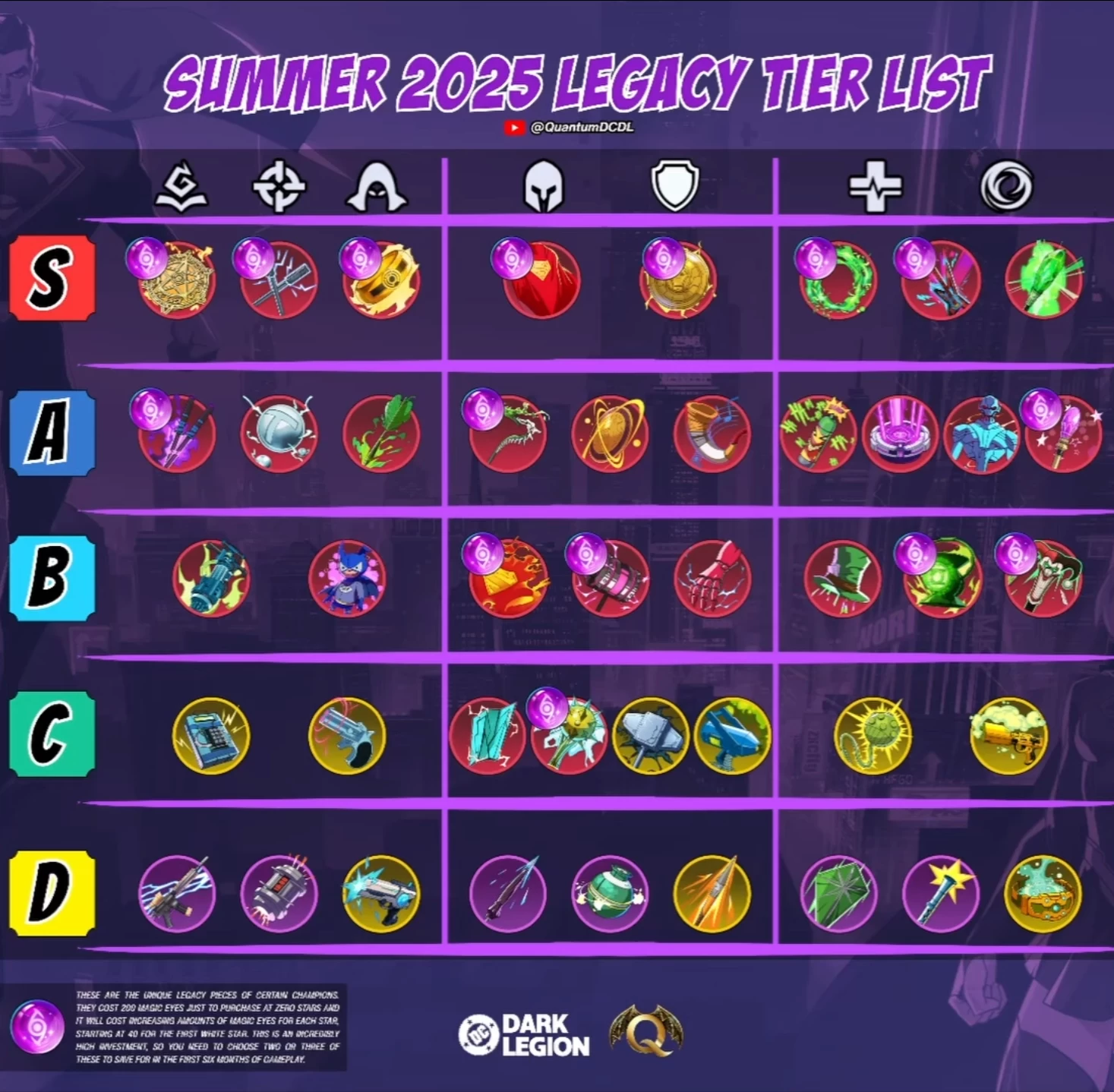 На скриншоте указаны топовые, средние и нишевые артефакты для героев DC Dark Legion, актуальные для лета 2025 года.