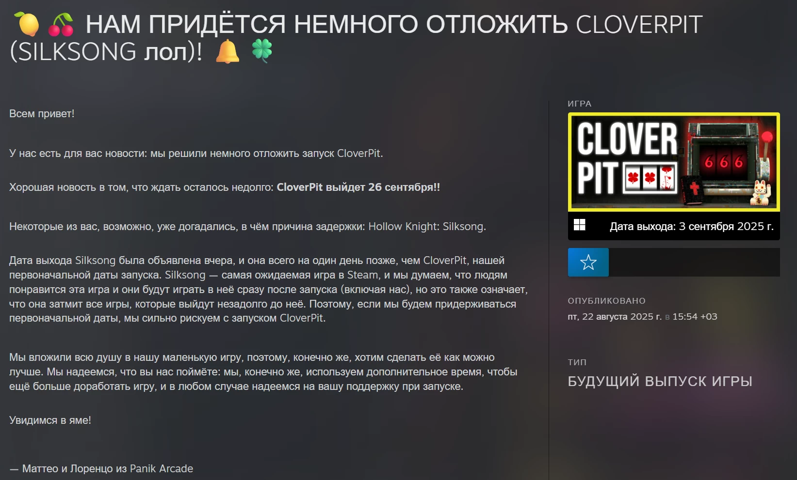 PC-версия Clover Pit теперь выйдет не 3, а 26 сентября. Об этом заявили разработчики, указав на главную причину — близкий выход Hollow Knight: Silksong.