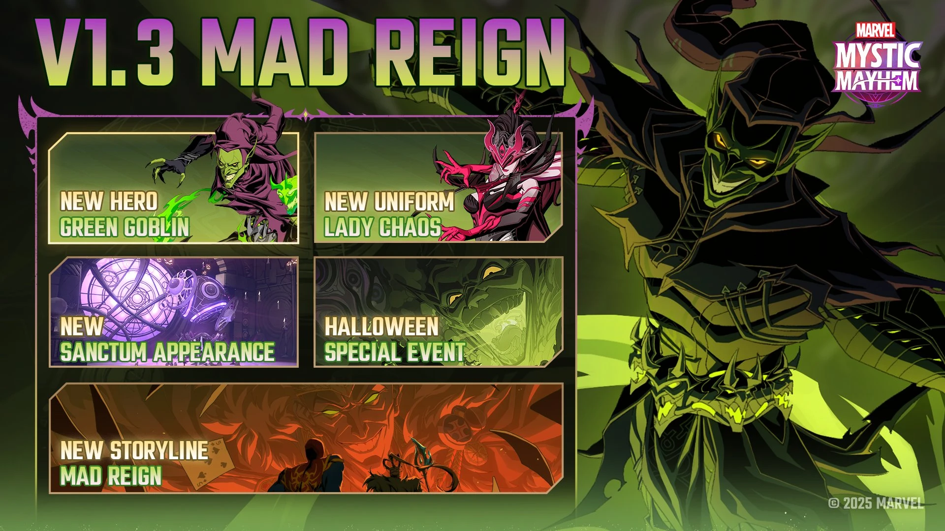 23 октября в MARVEL Mystic Mayhem появится новый персонаж — Зелёный Гоблин. Вместе с ним обновится главное меню, появится хэллоуинский особый ивент, откроется новый сюжет и появится костюм для Леди Хаос.