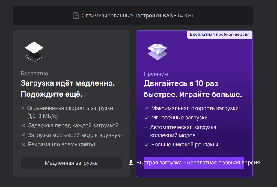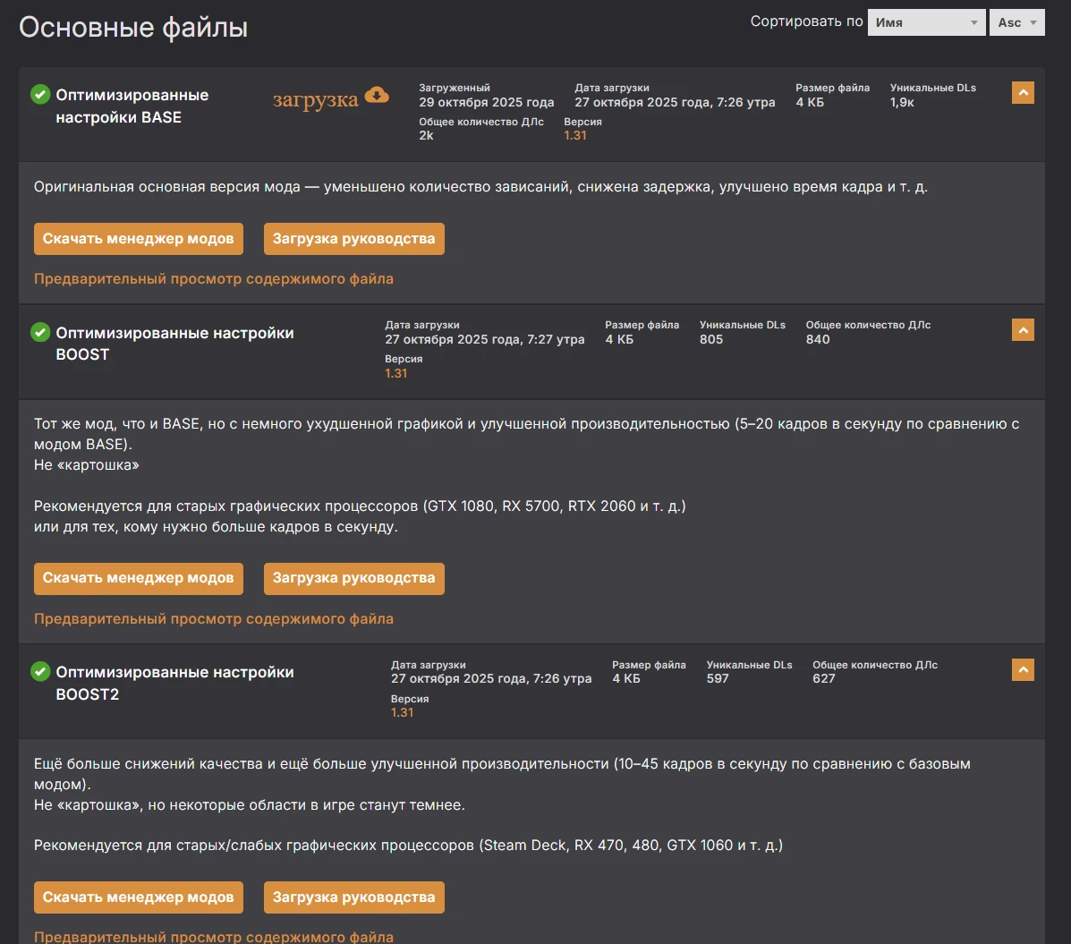 На сайте NexusMods в разделе «Files» видим 3 файла. Обычный для всех сборок и два дополнительных для более старых видеокарт. Выберите нужный вам и нажмите «Загрузка».