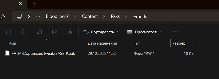 В скачанном архиве будет PAK-файл. Его нужно скопировать по пути «Bloodlines2 > Content > Paks > ~mods». Если папки «~mods» нет, создайте её.