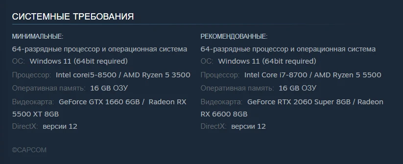 Для игры в Resident Evil Requiem рекомендуется на PC: