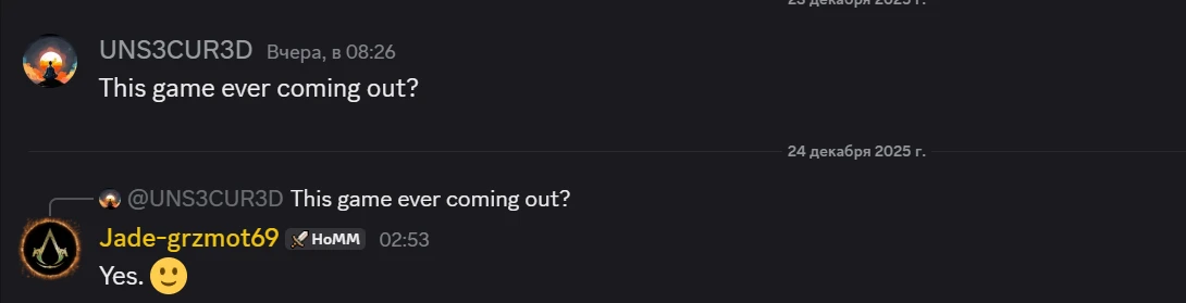 Теперь сам администратор Discord-канала AС Jade обратился к толпе. На вопрос «Эта игра когда-нибудь выйдет?» он ответил «Да». До этого игрокам в чате отвечал бот. Ждём свежих новостей в 2026 году или хотя бы поздравление с Китайским Новым годом.