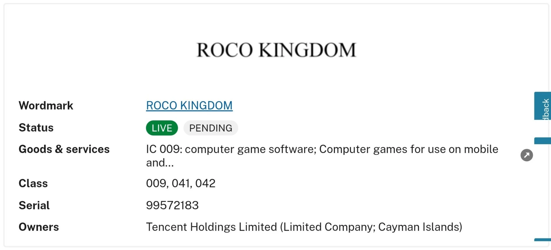4 января 2026 года стало известно, что Tencent подал заявку на регистрацию торгового знака Roco Kingdom. Среди категорий указано, что это компьютерная видеоигра с поддержкой смартфонов.