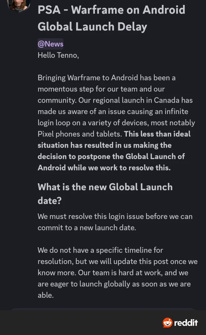 Warframe Mobile должны были выпустить 18 февраля. За день до назначенной даты разработчики сообщили, что во время софт-запуска в Канаде они выявили ряд проблем.