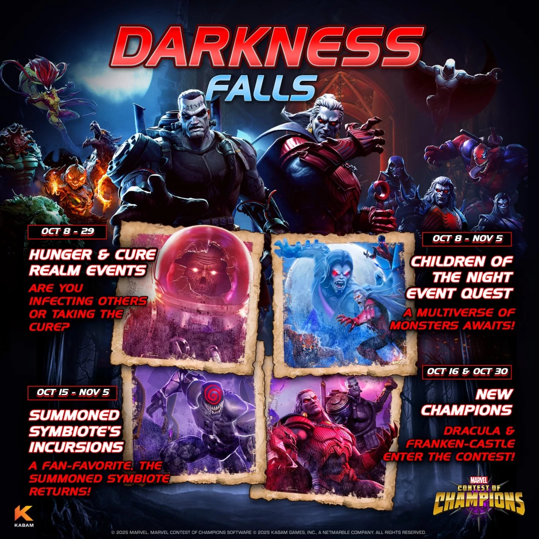 С 8 октября в Marvel Contest of Champions начинается мрачный сезон в честь празднования Хэллоуина. Его открывает ивент «Голод и лекарство», который продлится с 8 по 29 число. Также с 8 октября и по 5 ноября параллельно пройдёт квестовый ивент «Дети ночи» с разными суперзлодеями и монстрами вселенной Marvel, включая Морбиуса и оборотня.