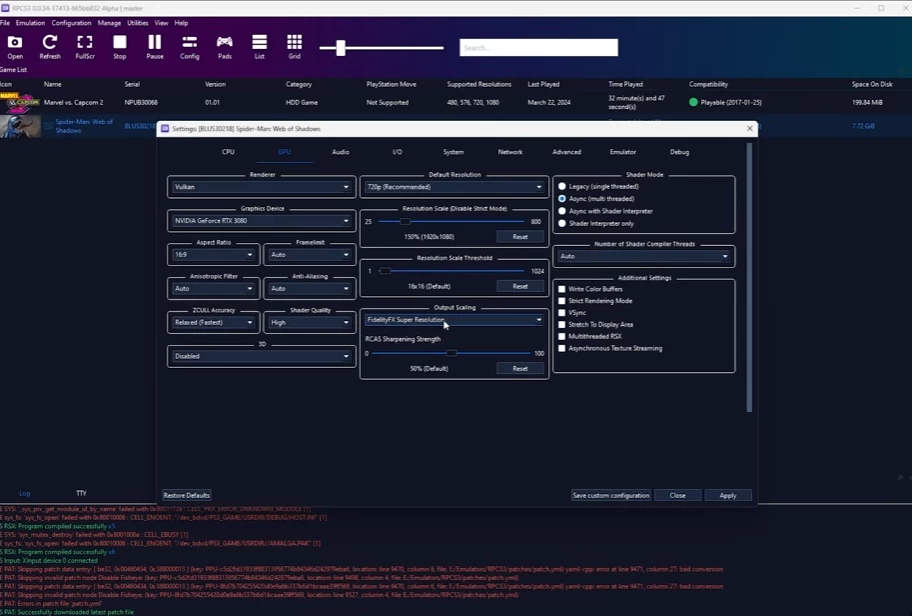 Далее поговорим о PS3-версии. Сыграть в неё можно через RPCS3. Если у вас достаточно мощный смартфон с активным охлаждением, можете даже попробовать запустить эту версию Web of Shadows на Android через aPS3e. Расширенные настройки эмулятора позволяют точечно настроить картинку и «подтянуть» её с 720p до разрешения вашего экрана с помощью FSR. Также, в отличие от PC-версии, в RPCS3 есть нативная поддержка контроллеров Xbox и PlayStation. Единственное, к чему стоит готовиться — к компиляции шейдеров, из-за чего геймплей может тормозить.