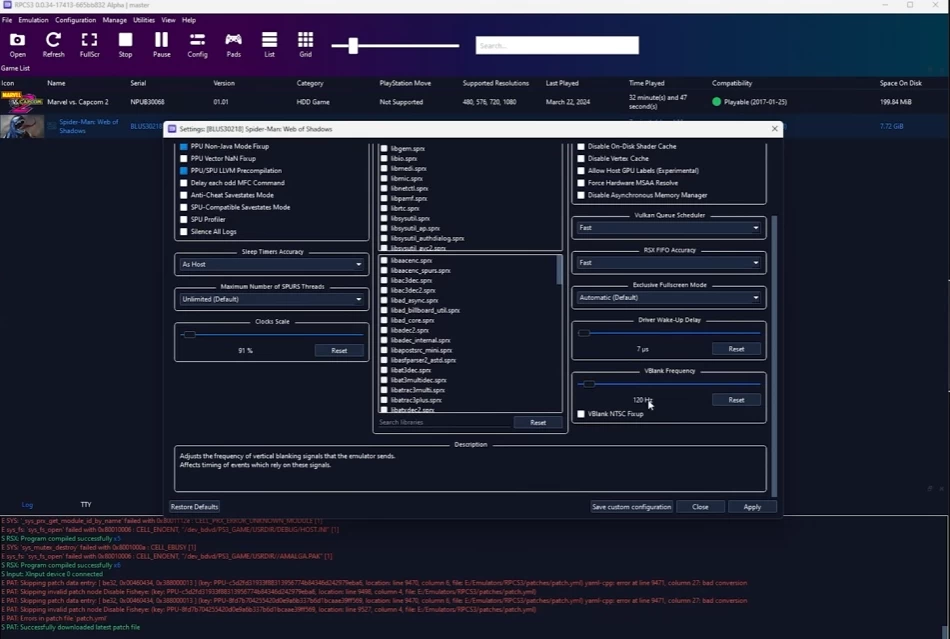 Настройки Web of Shadows в RPCS3. Чтобы получить 60 FPS, нужно выставить 120 Hz.
