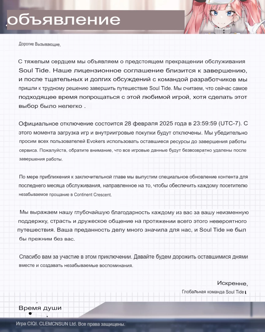 Издатель Ujoy Games сообщил, что мобильный проект Soul Tide закроют 28-го февраля. Он вышел в 2021 году в Японии и в 2022 году на Западе. С тех пор игра не получила ни одной новости и ни одного гайда на AppTime. В своём прощальном письме разработчики и издатель не говорят прямо, что Soul Tide провалилась, не стала популярной и не приносила достаточно денег. Они просто сообщили, что сервера придётся закрыть из-за истечения срока лицензии.