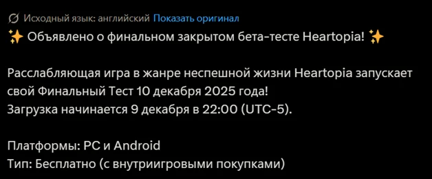 Разработчики Heartopia опубликовали свежий пост в X. В нём они сообщили, что финальный бета-тест пройдёт 10-го декабря. Стоит ожидать, что в начале 2026 года состоится официальный релиз глобальной версии. Пока детали уточняются, но стоит ожидать, что поиграть сможет куда больше игроков на iOS, Android и PC.
