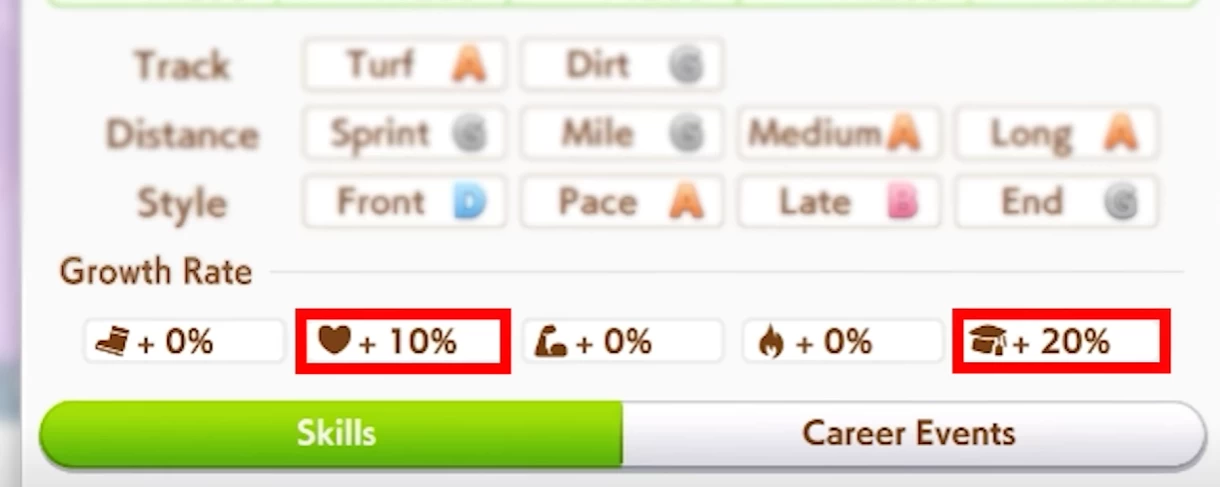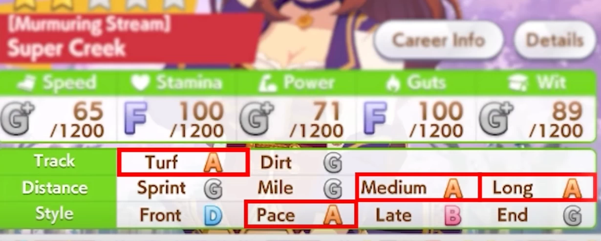 Во время тренировок Super Creek получает +10% к прокачке выносливости и +20% к прокачке ума. Благодаря этому она дольше поддерживает одну скорость и чаще активирует навыки.