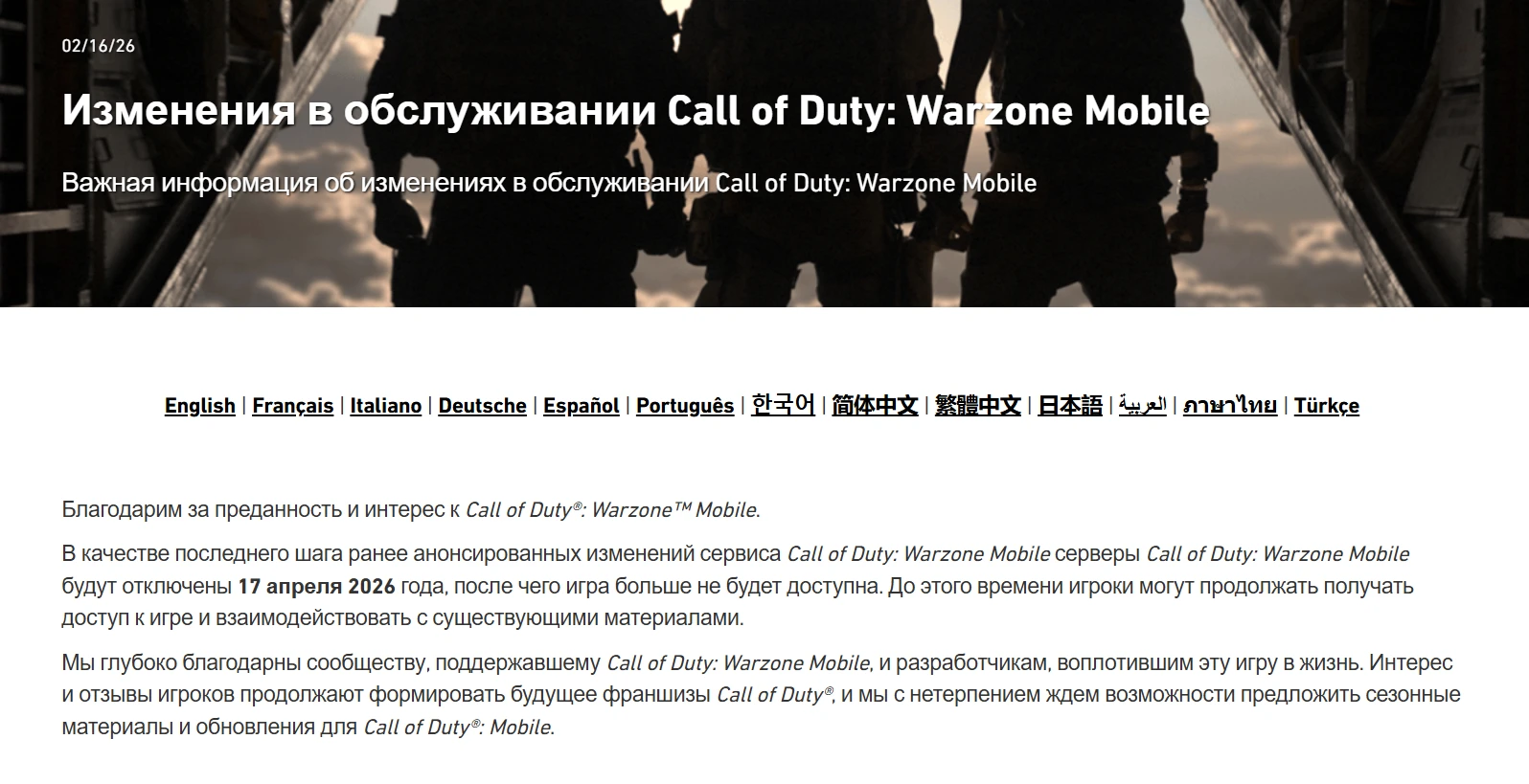 16 февраля на сайте поддержки Activision опубликовали пост, в котором рассказали не совсем приятные новости для фанатов Call of Duty: Warzone Mobile. Дело в том, что все сервера игры закроют 17 апреля 2026 года. После этого игра больше не будет доступна ни для кого.