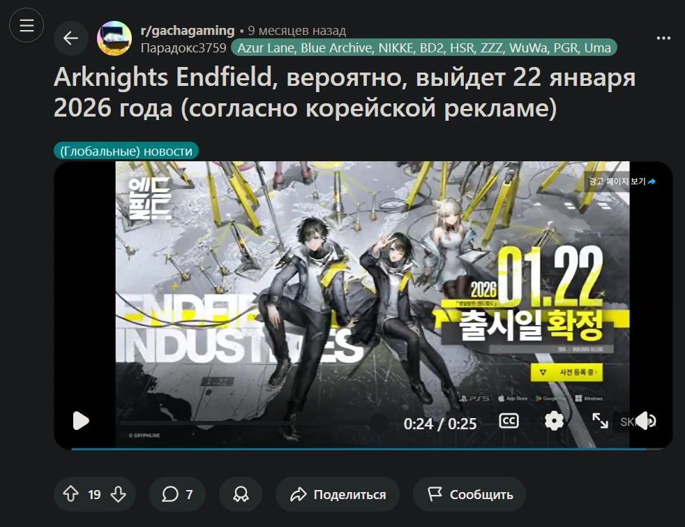 В Reddit опубликовали пост, в котором показали новую рекламу Arknights Endfield в Южной Корее. В конце неё написано «Дата выхода подтверждена — 22 января 2026 года». Стоит ожидать, что более точное подтверждение покажут во время мероприятия The Game Awards 2025, которое пройдёт 12-го декабря в 3:30 ночи по мск. Считается, что рекламу Arknights Endfield в Корее начали показывать раньше времени. На фоне этого пользователи Reddit начали шутить, что «стажёру не поздоровится».