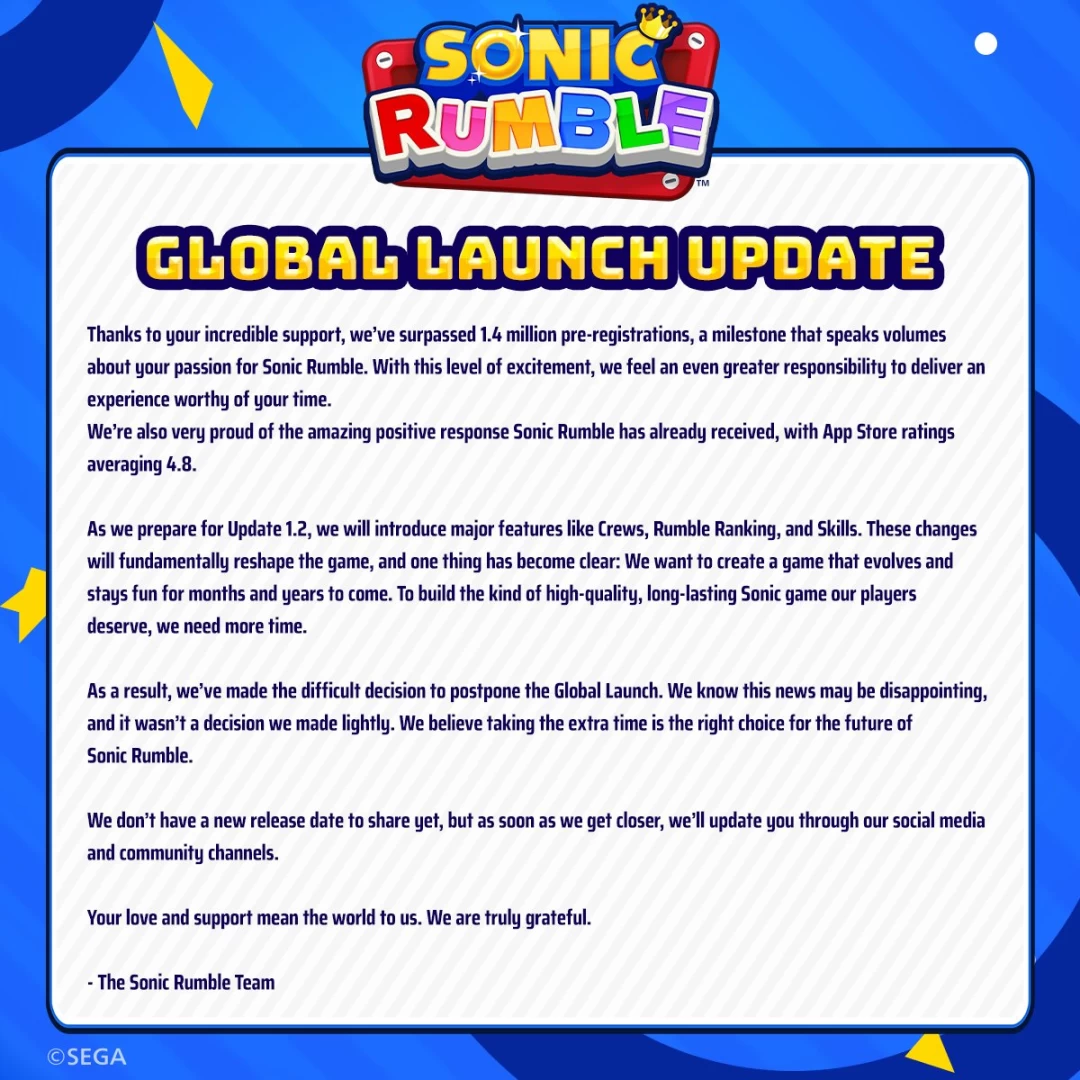 30 апреля на официальной странице Sonic Rumble в X опубликовали заявление по поводу глобального релиза — Rovio Entertainment и SEGA перенесли дату выхода из-за того, что игра ещё не приняла свою финальную форму. Главная цель для разработчиков это сделать так, чтобы Sonic Rumble изменялась и оставалась активной на годы вперёд, а не выпустить её как можно раньше.