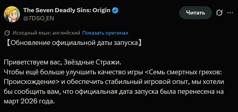 Создатели The Seven Deadly Sins: Origin опубликовали англоязычный пост 16 января, в котором сообщили о переносе даты выхода глобальной версии. Если раньше её планировали выпустить в январе, то теперь — в марте 2026 года. Некоторые игроки связывают такое решение с крупным конкурентом в лице Arknights Endfield, который также выходит в январе.