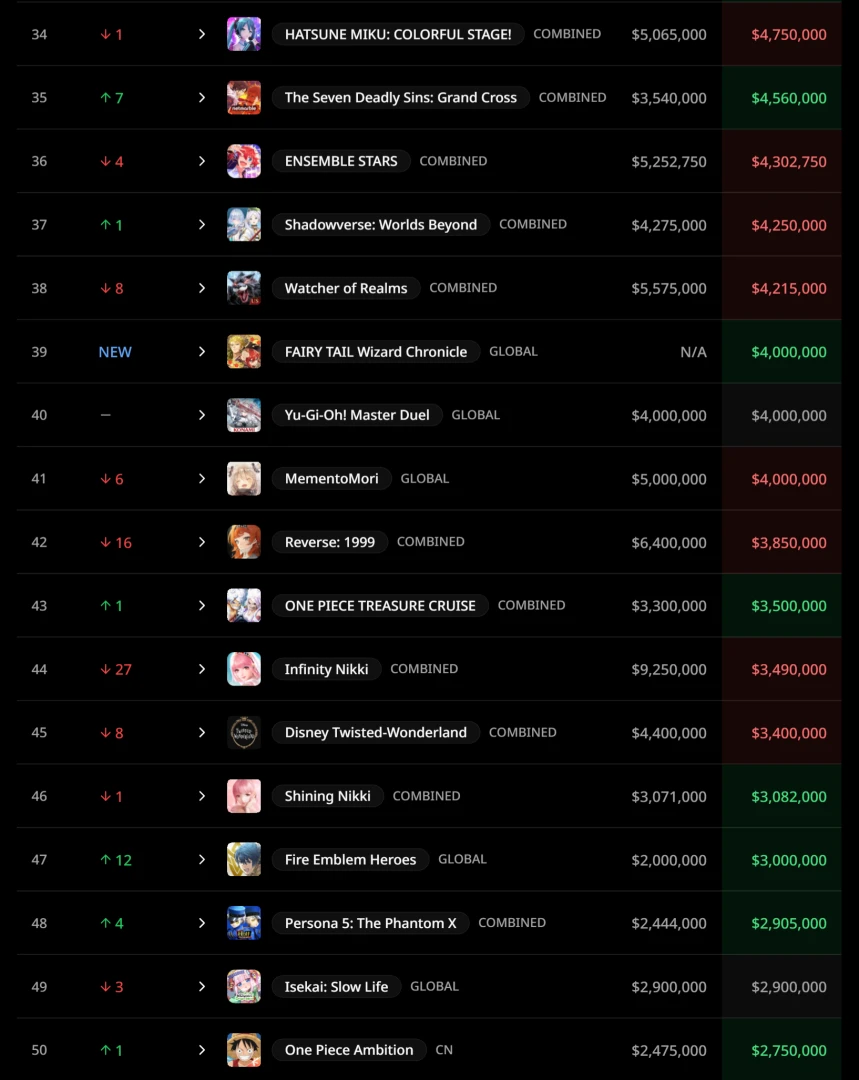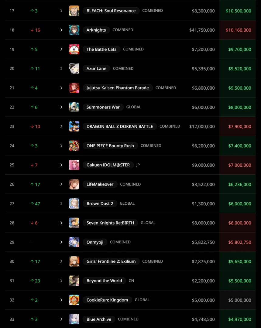 Самой провальной игрой стала китайская Once Piece Ambition — $2,7 млн. Ещё нишевыми стали Isekai: Slow Life, Persona 5: The Phantom X и Fire Emblem Heroes.