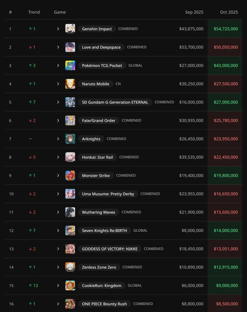 Вы можете удивиться, но в сентябре этого года самой доходной аниме-гачей была Love and Deepspace. Вероятно, с добавлением пользовательского контента HoYoverse удалось вырваться вперёд, поэтому в октябре первое место заняла Genshin Impact — $54,7 млн у Геншина против $50,05 млн у Love and Deepspace.