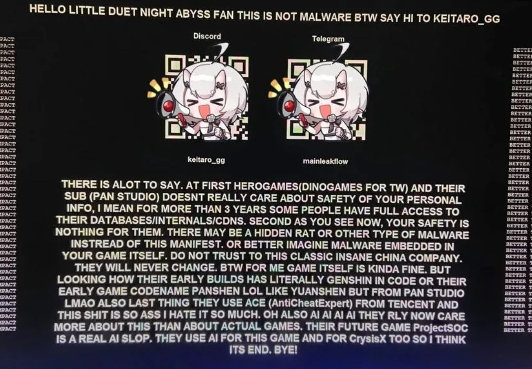Вчера некоторые игроки Duet Night Abyss столкнулись с тем, что при попытке подключиться к серверам игры, они попали на сервер хакера. Он использовал эту возможность для критики в сторону студии Hero Games. С его слов, её сотрудники не заботятся о безопасности данных своих игроков.