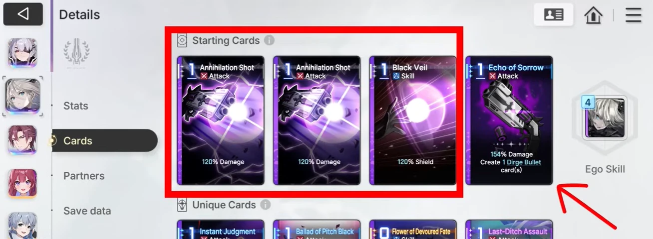 Стартовые и базовые карты — почти взаимозаменяемые понятия. Когда вы только начинаете играть в Chaos Zero Nightmare, у вас будут только стартовые карты. Три из них с белым текстом — это базовые карты.