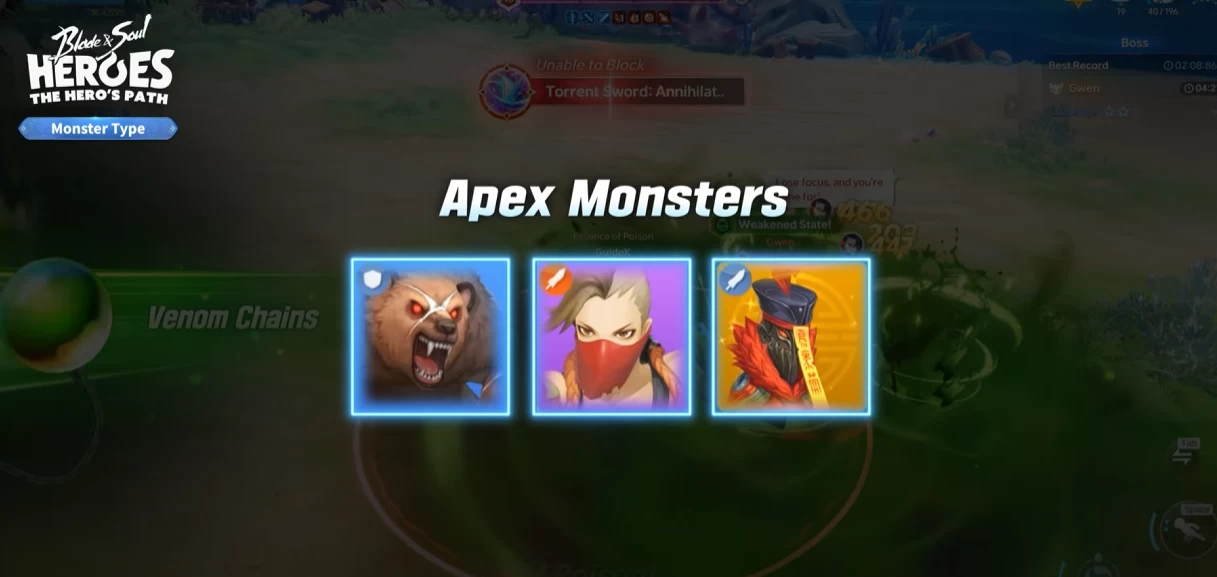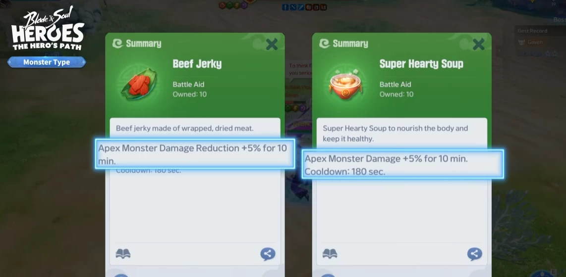 Ещё в Blade & Soul Heroes есть Apex-монстры — они намного сильнее обычных и имеют цветную рамку. Чтобы победить их, важно использовать еду. С её помощью вы получите баффы, но важно учитывать, что усиления с подписью «Apex Monster» работают только против этого типа врагов.