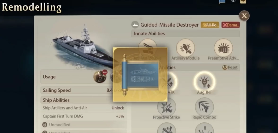 Корабли можно улучшать с помощью чертежей. Всего можно выбрать 2 улучшения. Если нажать на кнопку «Сброс», вы получите назад потраченные материалы.