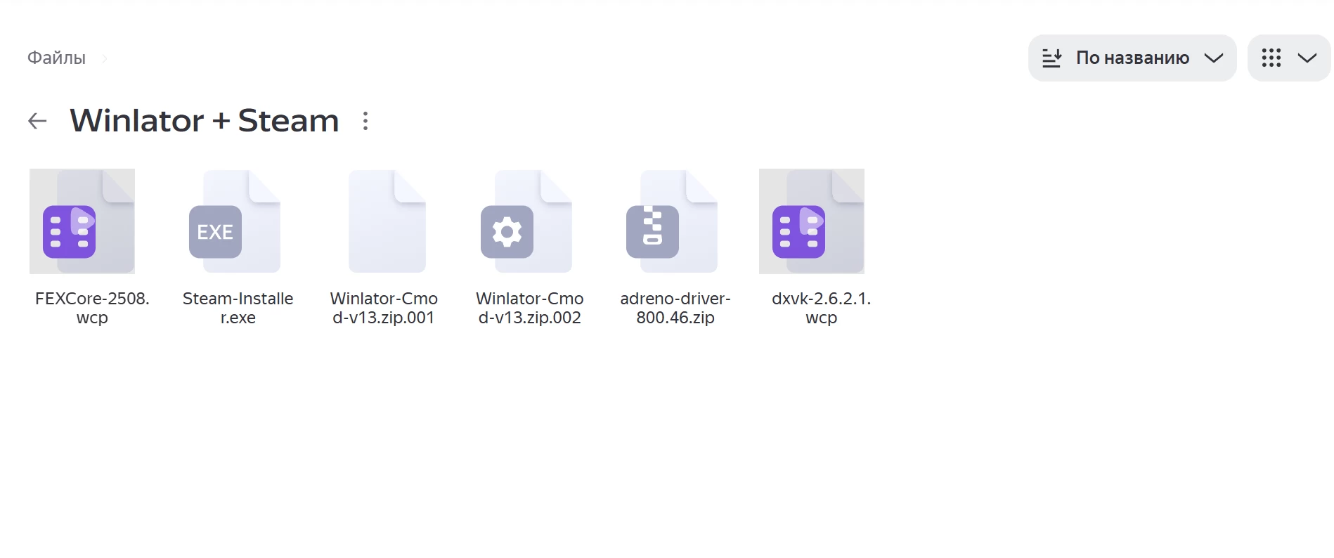 Сначала нужно скачать важные файлы — сам Winlator v13, FexCore 2508, DXVK 2.6.2 Async и драйвер Adreno 800.46 для SD 8 Elite. Помимо этого нам понадобится установщик Steam. Все нужные файлы я удобно разместил на Яндекс Диске. Если у вас не 8 Elite, то драйвера можно скачать через GitHub. Если у вас чипсет не Snapdragon, используйте Vortek или OpenGL на свой страх и риск.