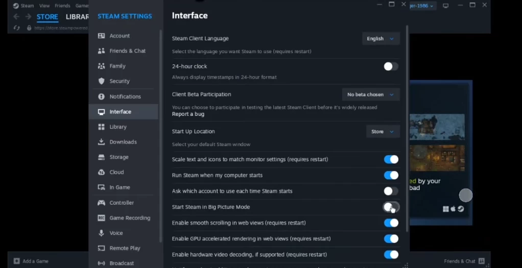 После входа в Steam, откройте настройки, войдите в раздел Interface и включите опцию «Запускать Steam в режиме Big Picture». Далее нажмите View → Big Picture.