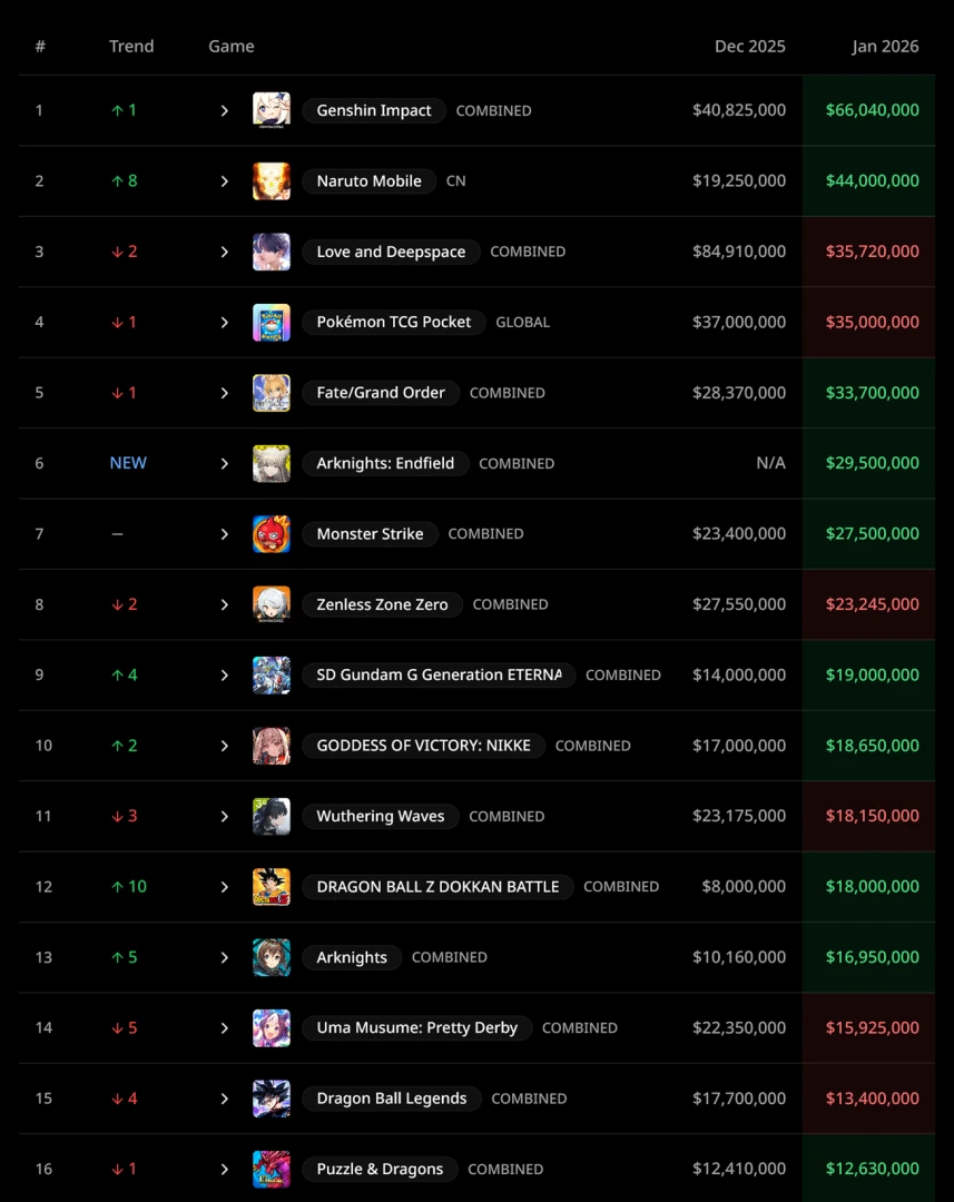Январь 2026 года расставил всё на свои места. На этот раз Genshin Impact занимает топ-1 с $66,04 млн. Эта цифра получилась после сложения доходов с глобальной и китайской версий.