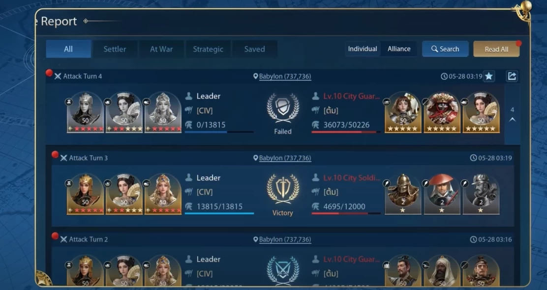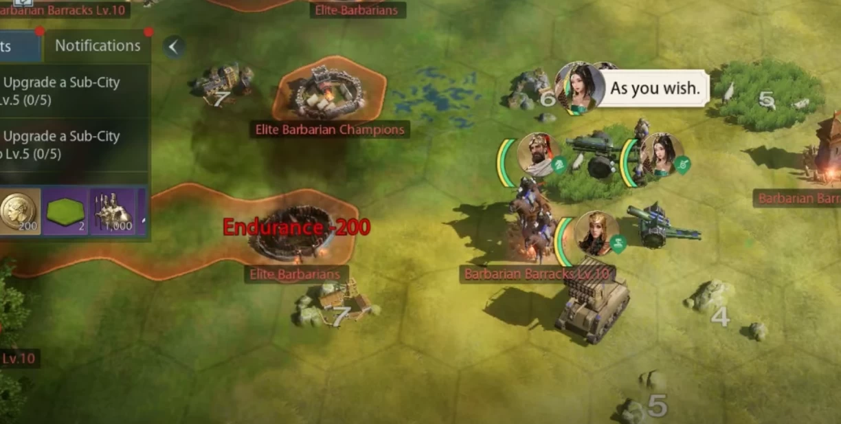 Третий этап — осада. Этим занимаются специальные наземные юниты по типу артиллерии. Их должен взять с собой главный герой в вашем отряде. После прибытия на место, осадные орудия открепляются от него и начинают атаковать вражеское строение — до 3 выстрелов и с перезарядкой 10 минут. Каждый выстрел стоит 15 AP, а дальность стрельбы — 2-5 клеток.